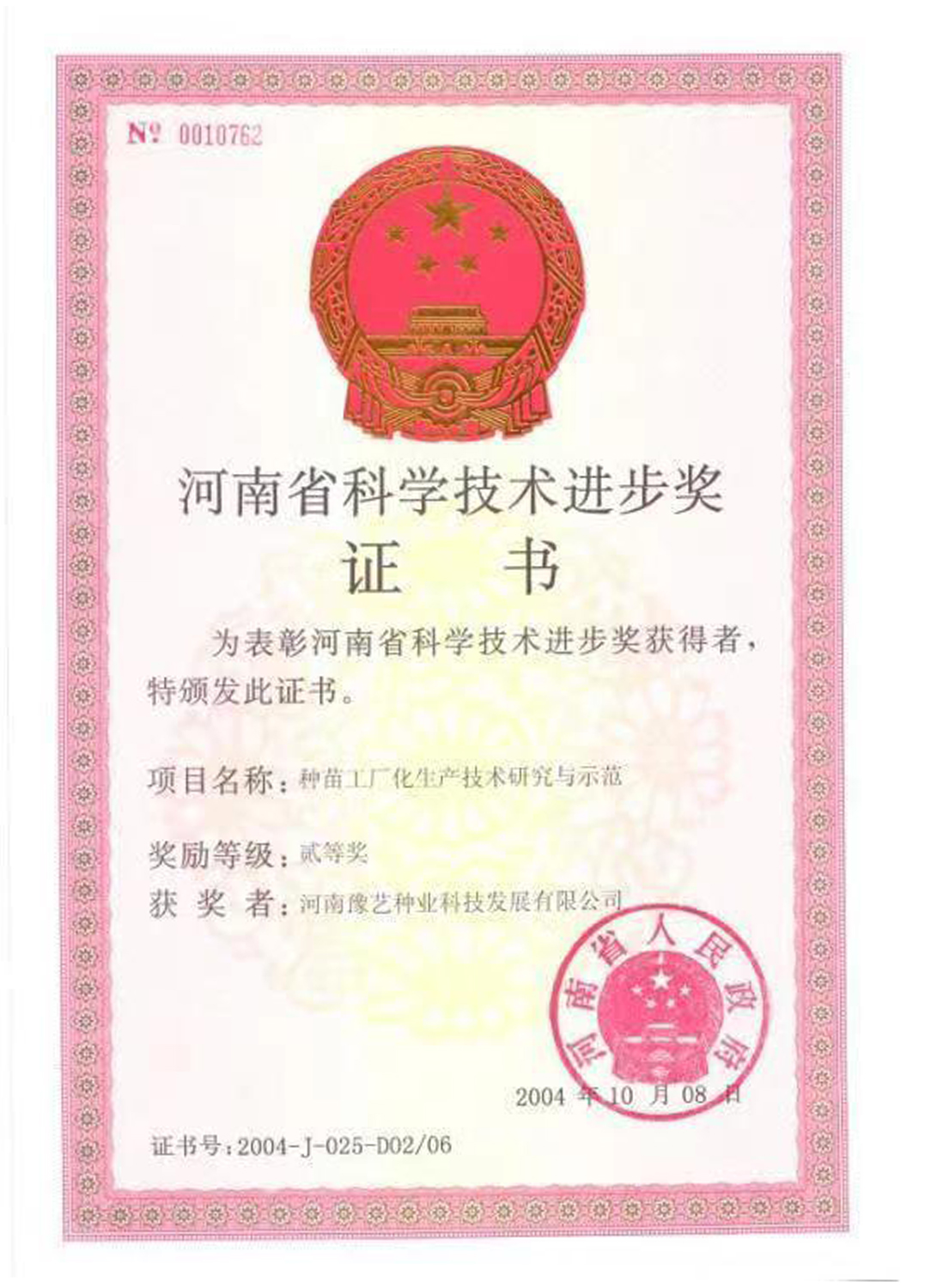 河南省科學(xué)技術(shù)進(jìn)步獎證書